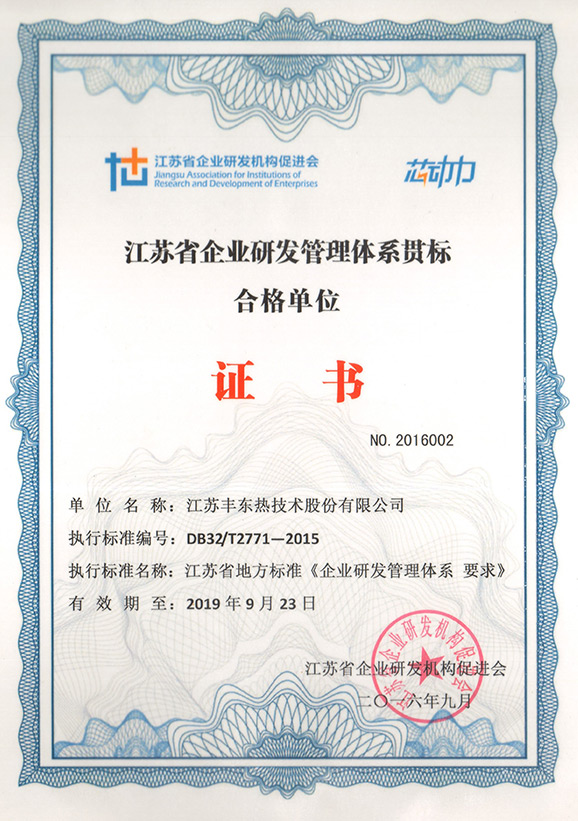 2016年3月、豊東株式はDB32/T2771-2015「企業研発管理システム」によって企業研発管理システムを確立する。2016年9月、豊東株式は江蘇省企業研発機構促進会組織の外部審査を通しました。高い点数で「江蘇省企業研発管理システム適合証書」を得る。
