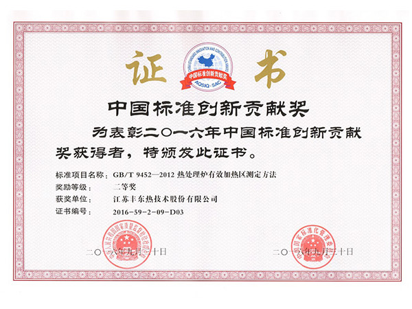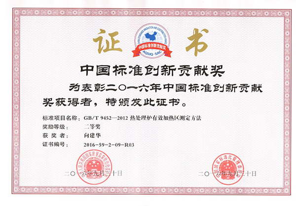 近日、豊東株式は主起草会社として起草制定した国家標準「GB/T 9452—2012 熱処理炉有効加熱区測定方法」は「2016年中国標準創新貢献二等賞」の称号を受賞。この賞は国家質量監督検査検疫総局と国家標準化管理委員会とで2006年共同設立した、標準化分野の全国性の賞です。目的は標準化仕事を推進して、「国民経済と社会発展第十一個五年計画概要」と「国家中長期科学と技術発展計画概要(2006-2020年)」を満足し、我が国標準化仕事に対して新しい要求を提出するものです。標準化仕事者の積極性と創造性を充分的に動かし、標準化分野の科技進歩を導き推進する。